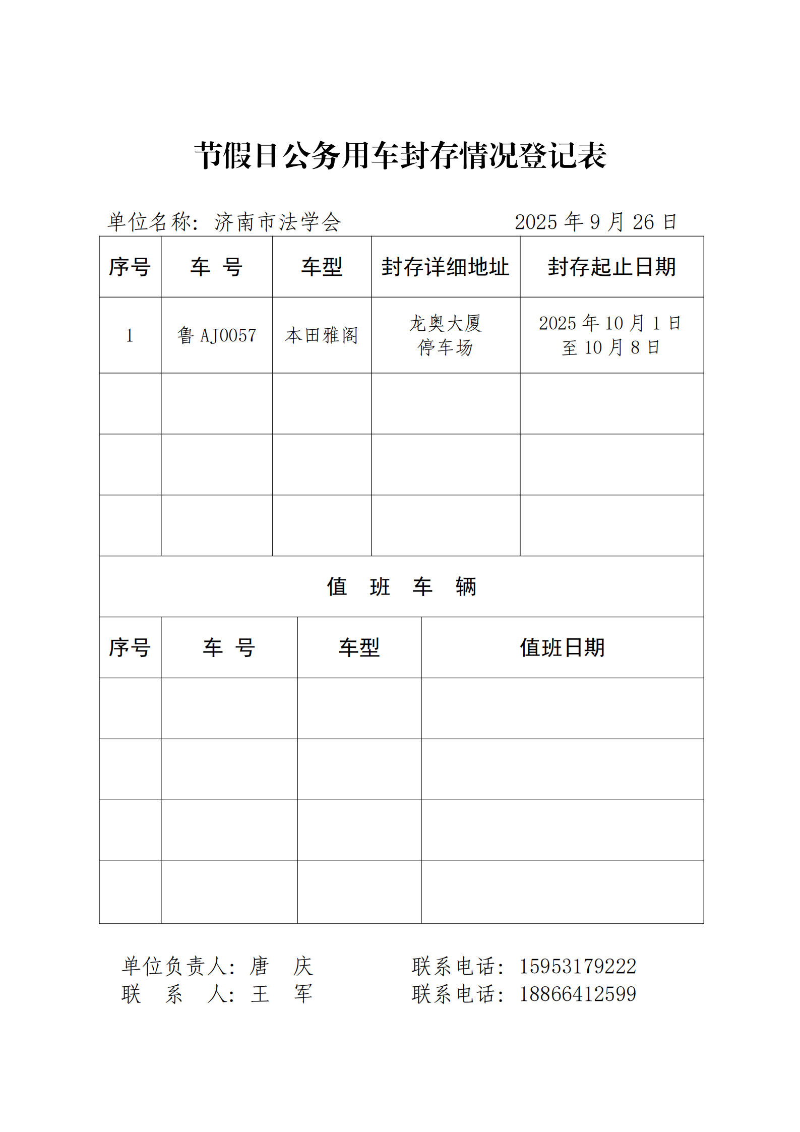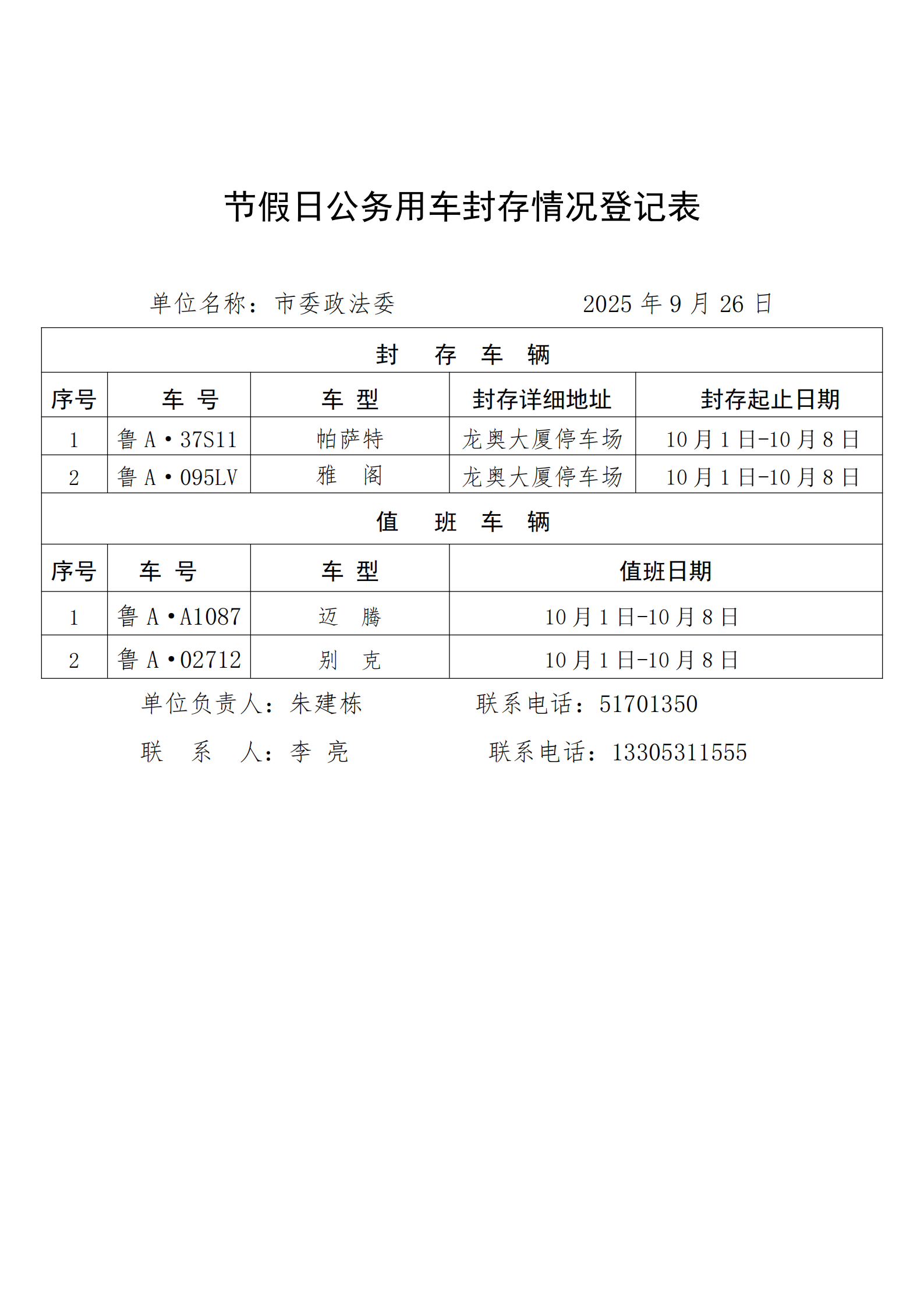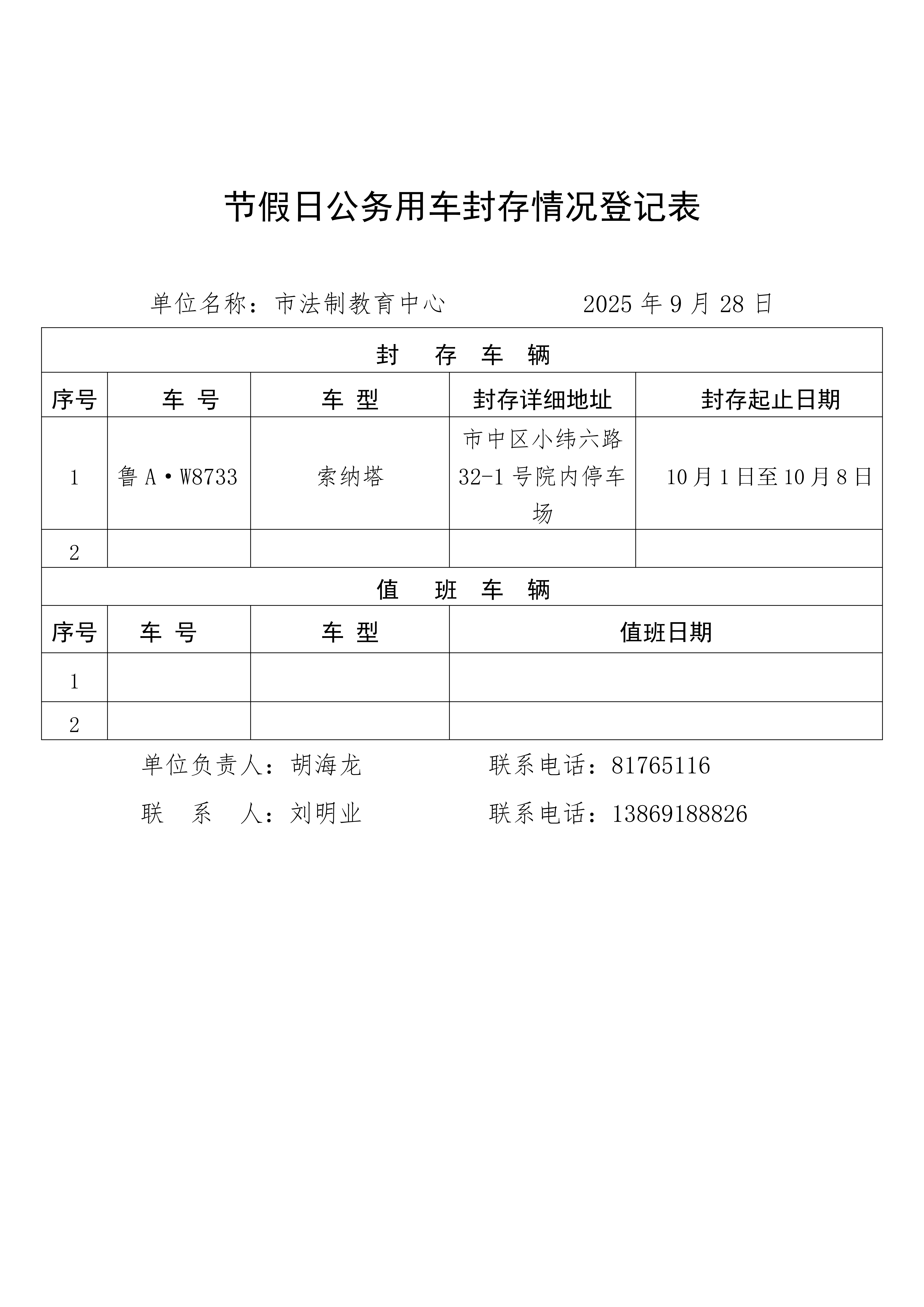 市委政法委及所属单位2025年国庆节假期公务用车封存情况登记表